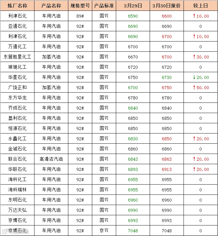 吉牛3月30日炼厂汽油报价