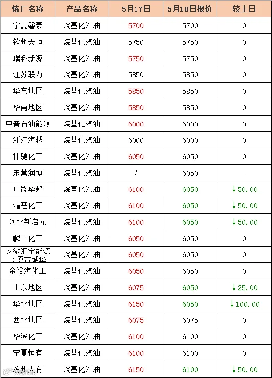 吉牛2021年5月18日地方炼厂,两大集团,MTBE,异辛烷报价