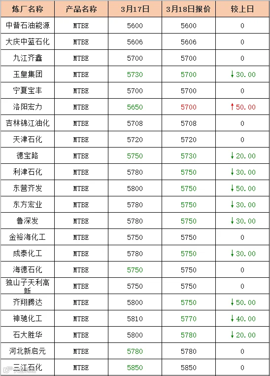 吉牛2021年3月18日地方炼厂,两大集团,MTBE报价