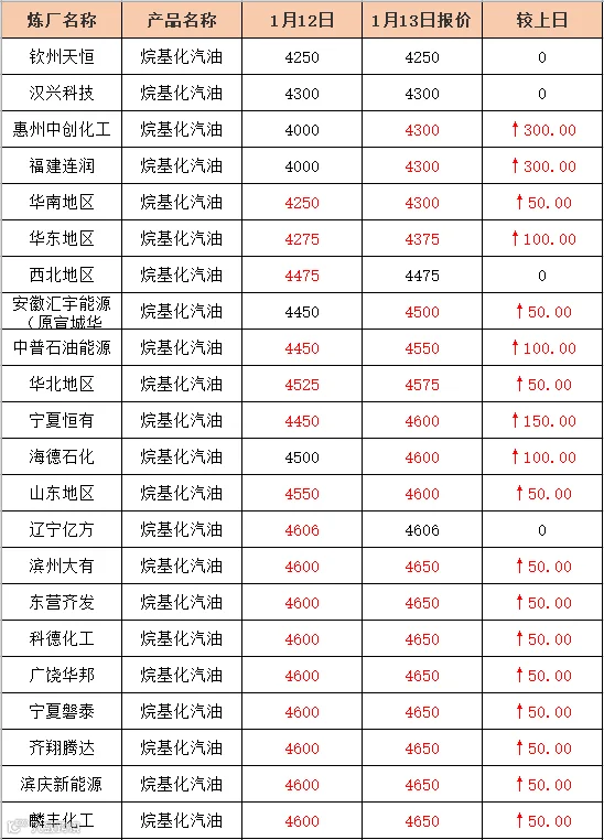 吉牛2021年1月13日地方炼厂,两大集团,MTBE,异辛烷报价