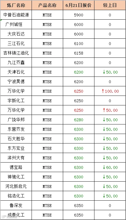 吉牛2021年6月21日地方炼厂,两大集团,MTBE,异辛烷报价