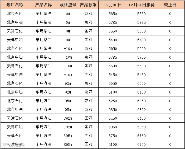 吉牛12月31日炼厂柴油报价