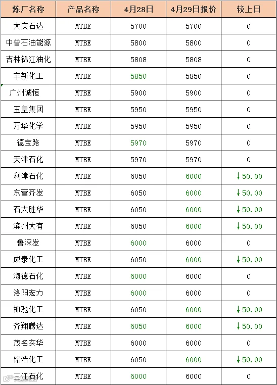吉牛2021年4月29日地方炼厂,两大集团,MTBE,异辛烷报价