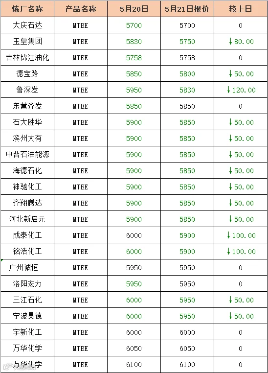 吉牛2021年5月21日地方炼厂,两大集团,MTBE,异辛烷报价