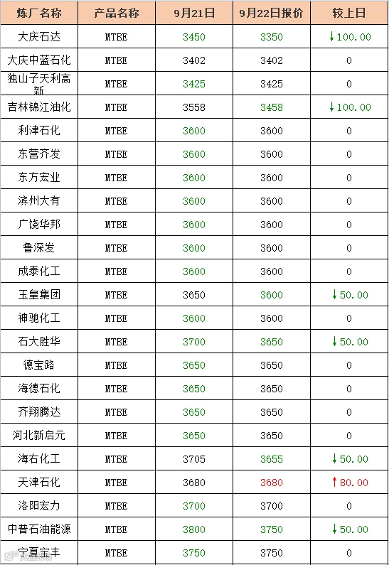 吉牛2020年9月22日地方炼厂,两大集团,MTBE,异辛烷报价