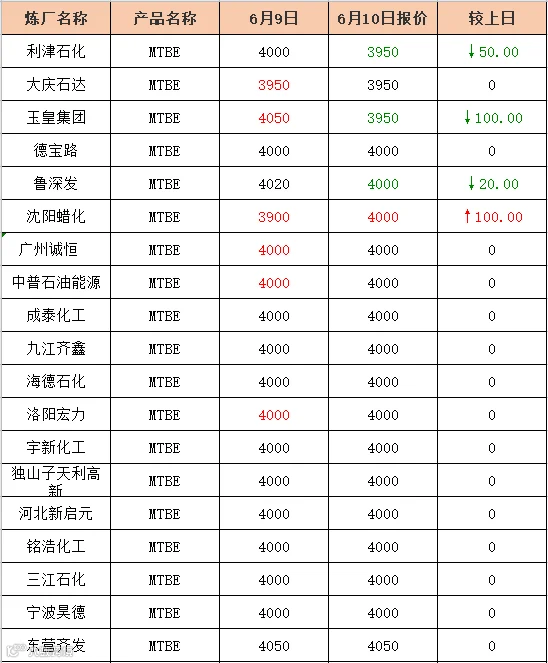 吉牛2020年6月10日地方炼厂,两大集团,MTBE,异辛烷报价