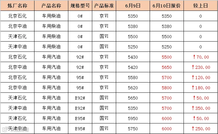 吉牛6月10日炼厂汽油报价