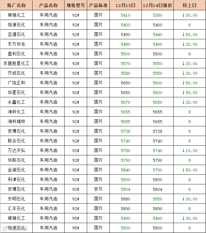 吉牛12月14日炼厂汽油报价