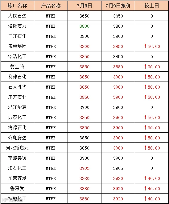 吉牛2020年7月9日地方炼厂,两大集团,MTBE,异辛烷报价