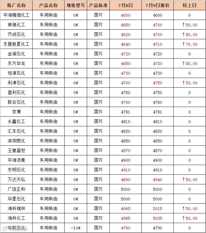 吉牛7月9日炼厂柴油报价