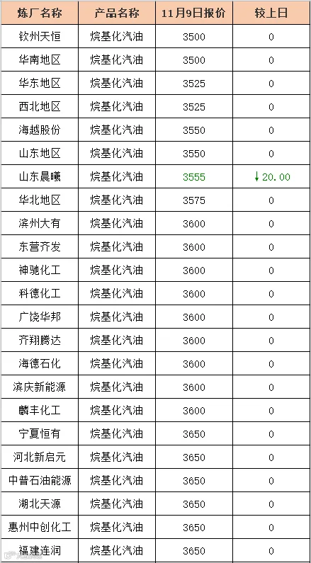 吉牛11月9日炼厂汽油报价