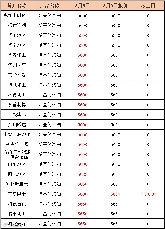 吉牛2021年3月9日地方炼厂,两大集团,MTBE,异辛烷报价