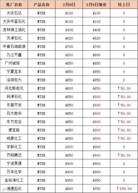 吉牛2021年2月9日地方炼厂,两大集团,MTBE报价
