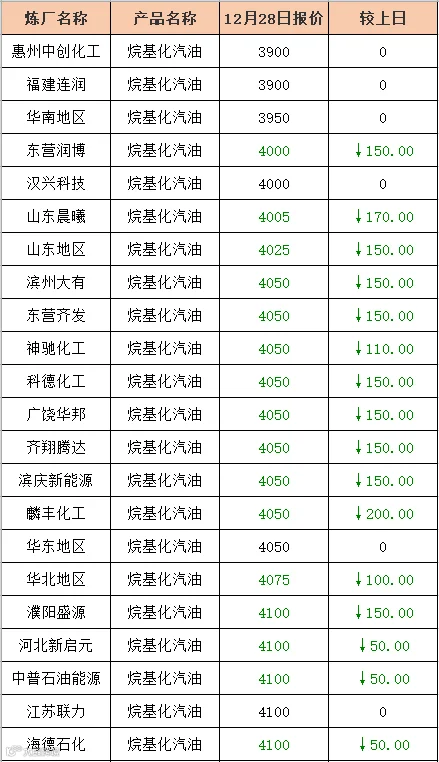 吉牛12月28日炼厂汽油报价
