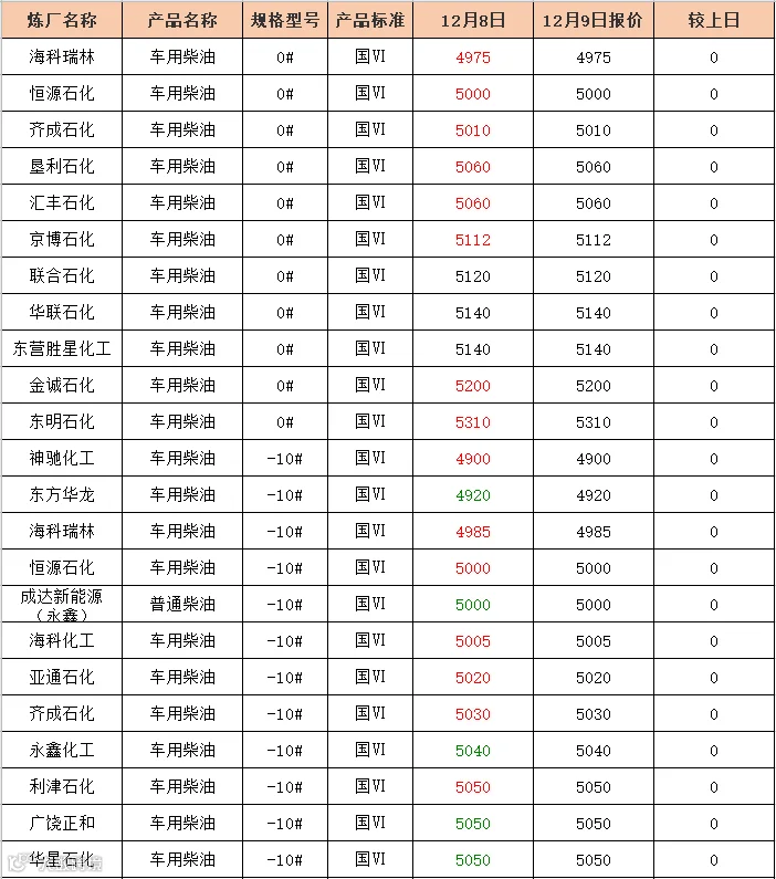 吉牛12月9日炼厂柴油报价