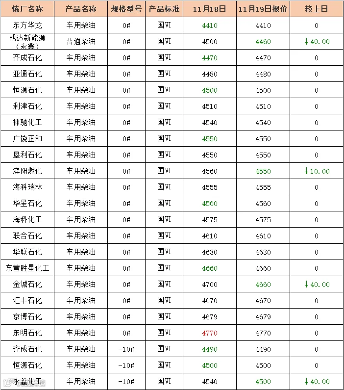 吉牛11月19日炼厂柴油报价