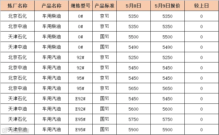 吉牛5月9日炼厂柴油报价
