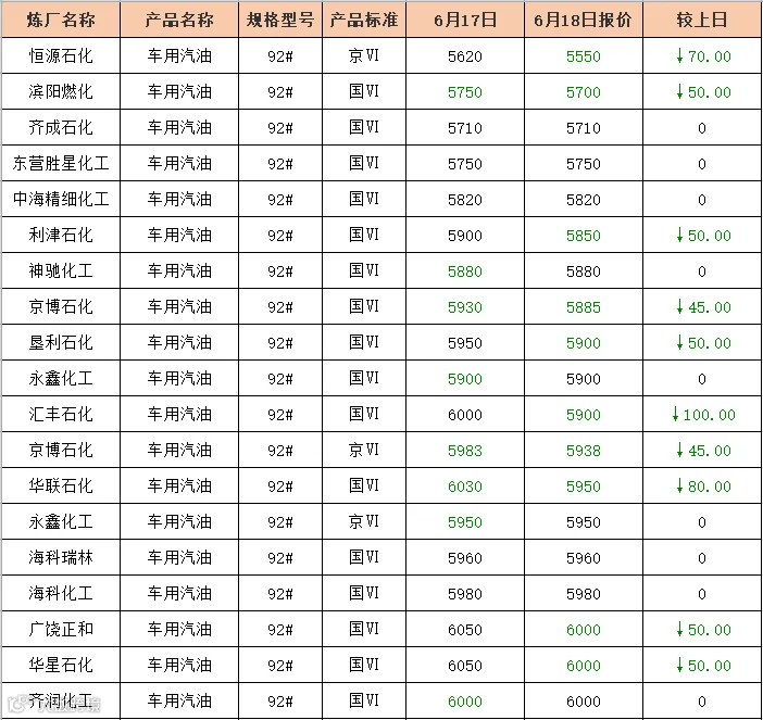 吉牛6月18日炼厂汽油报价
