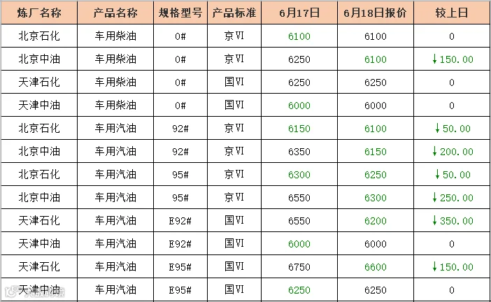 吉牛6月18日炼厂柴油报价
