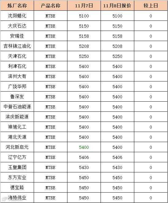 吉牛2019年11月8日地方炼厂,两大集团,MTBE,异辛烷报价