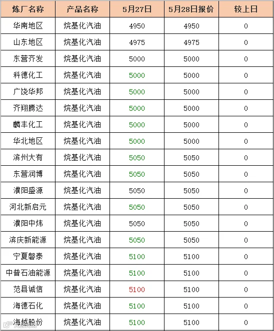 吉牛2019年5月28日地方炼厂,两大集团,MTBE,异辛烷报价