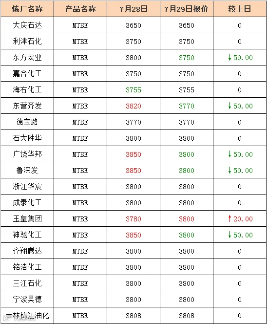 吉牛2020年7月29日地方炼厂,两大集团,MTBE,异辛烷报价