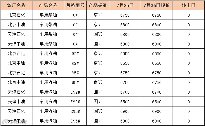 吉牛7月26日炼厂柴油报价
