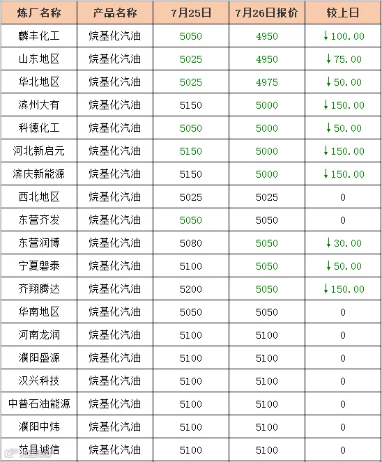 吉牛2019年7月26日地方炼厂,两大集团,MTBE,异辛烷报价