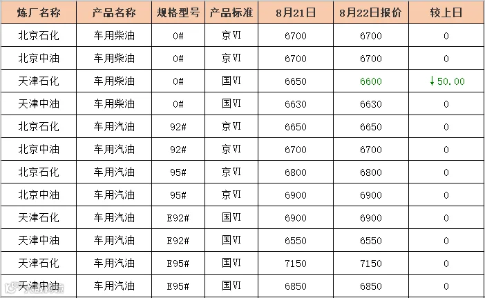 吉牛8月22日炼厂柴油报价
