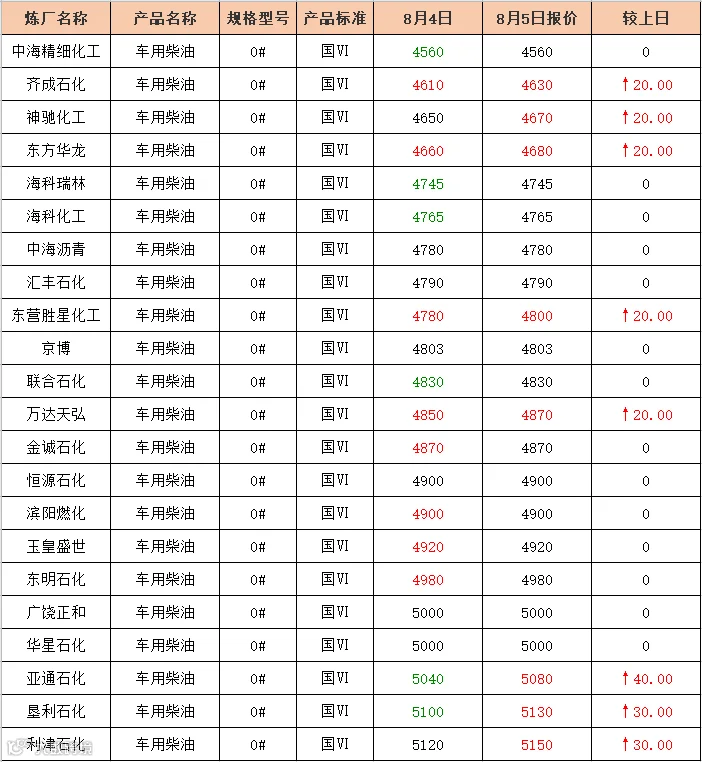 吉牛8月5日炼厂柴油报价