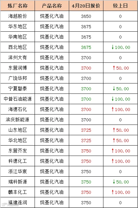 吉牛2020年4月20日地方炼厂,两大集团,MTBE,异辛烷报价