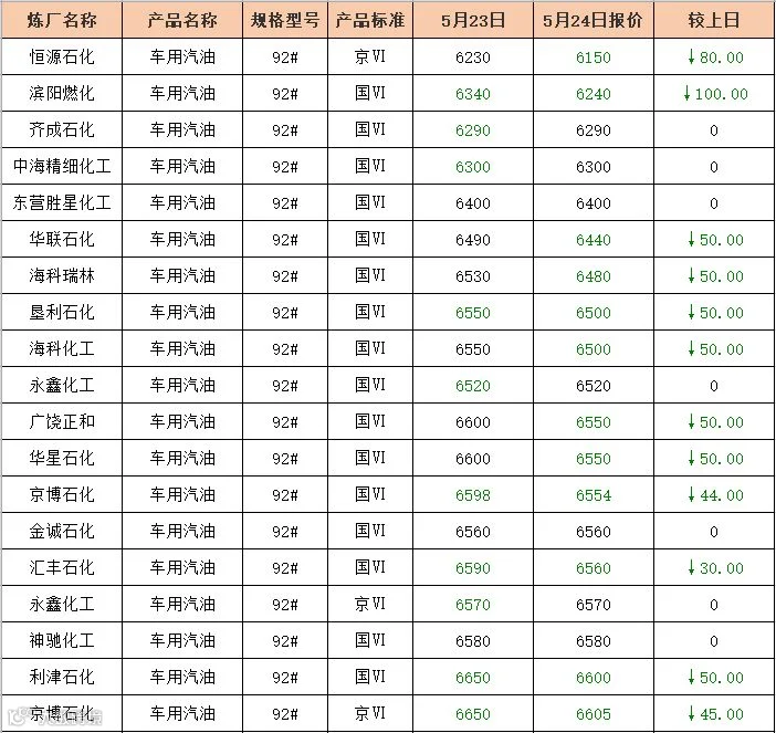 吉牛5月24日地方炼厂汽油报价
