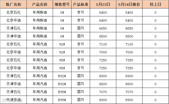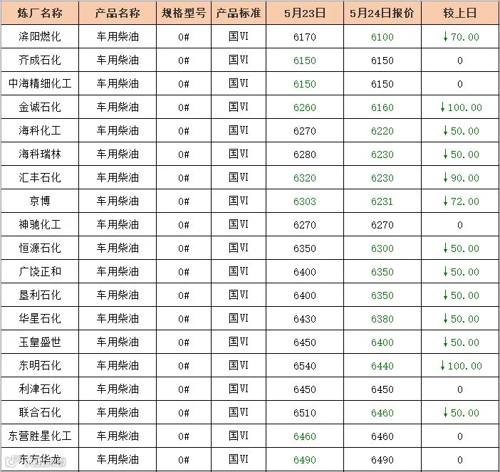 吉牛5月24日地方炼厂柴油报价
