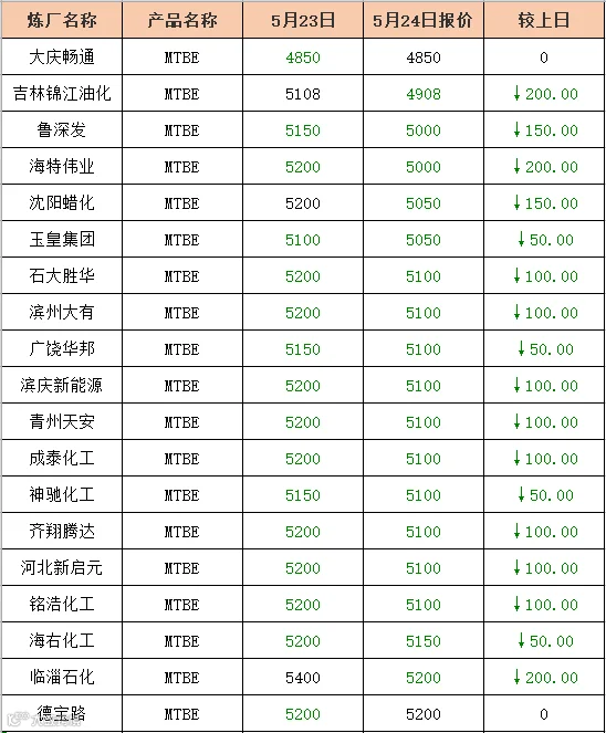 吉牛5月24日MTBE报价