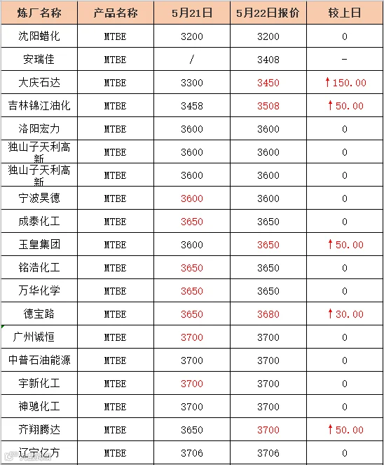 吉牛2020年5月22日地方炼厂,两大集团,MTBE,异辛烷报价