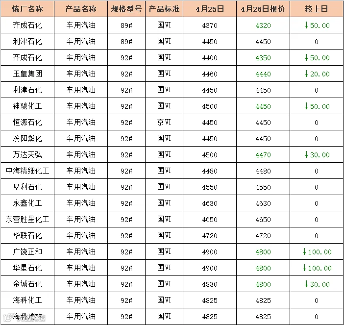 吉牛4月26日炼厂汽油报价