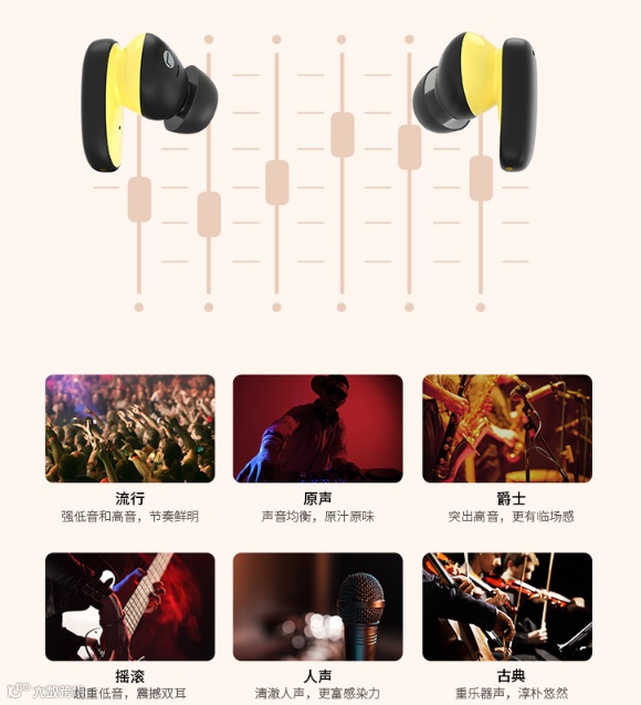 通过官方App提供6种EQ音效选项,用户可根据个人偏好自定义音质效果。