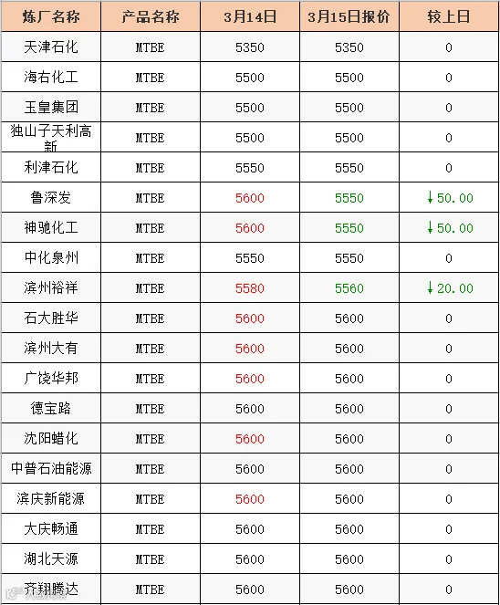 吉牛2019年3月15日地方炼厂,两大集团,MTBE,异辛烷报价