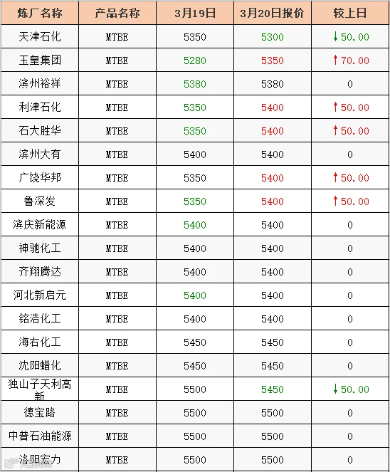 吉牛2019年3月20日地方炼厂,两大集团,MTBE,异辛烷报价