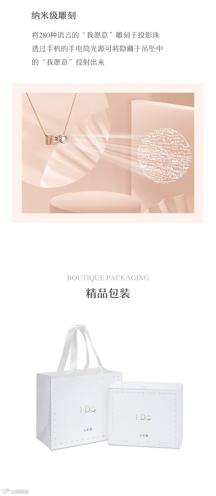 “I Do”——源自婚礼的誓言,代表着步入婚姻殿堂的爱侣对于爱情忠贞不渝的承诺。I Do将品牌名称化为重要元素融入产品设计之中,将280种语言的“我愿意”雕刻到投影珠,并嵌入字母“O”中,巧妙灵思见证世间不变的承诺,用心守护每一句“我愿意“。
