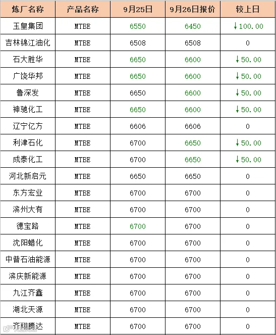 吉牛2019年9月26日地方炼厂,两大集团,MTBE,异辛烷报价