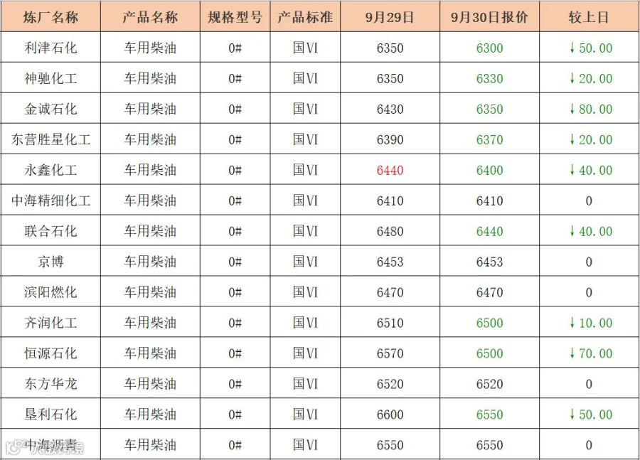 吉牛9月30日炼厂柴油报价