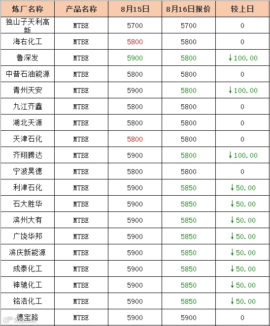 吉牛2019年8月16日地方炼厂,两大集团,MTBE,异辛烷报价