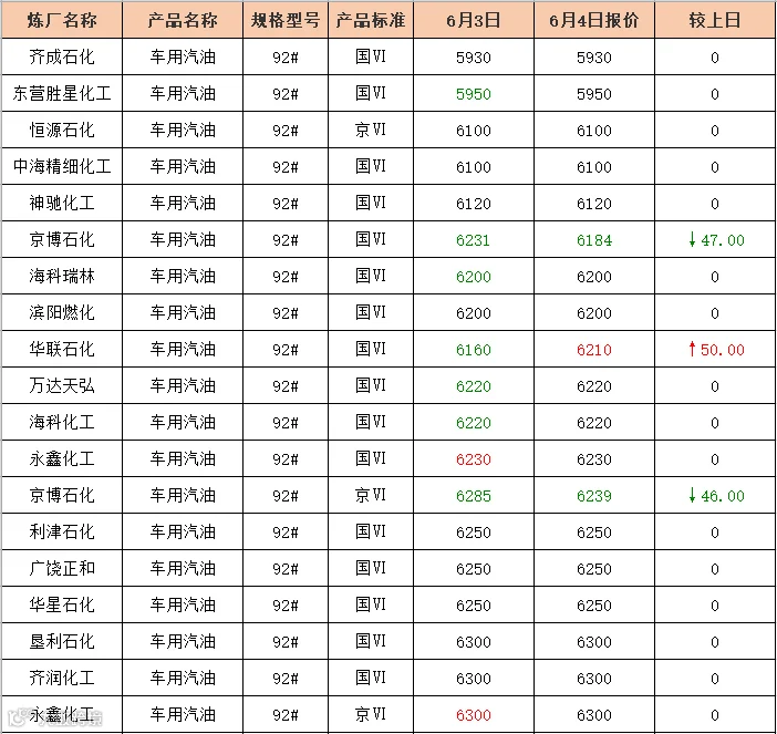 吉牛6月4日地方炼厂汽油报价
