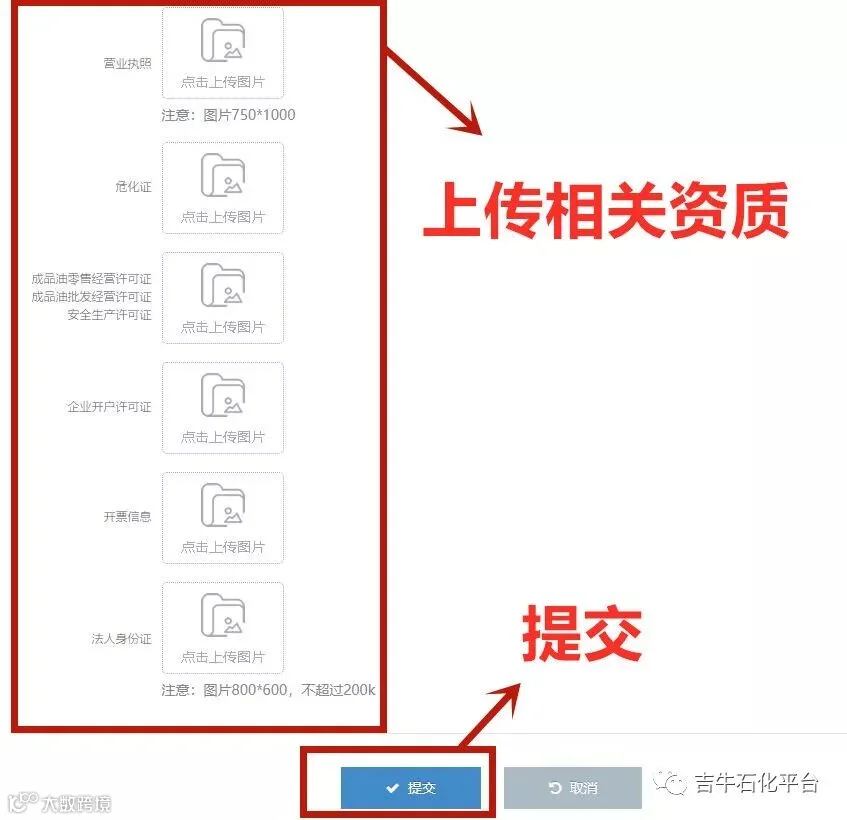 5.将页面下啦,在这里上传您企业的相关资质其中包括:营业执照、危化证、成品油零售经营许可证、成品油批发经营许可证、安全生产许可证、企业开户许可证、开票信息、法人身份证等相关证件的扫描件或原件照片,在这里注意:图片像素一定要是750*1000哦。最后点击”提交“就完成全部注册啦!