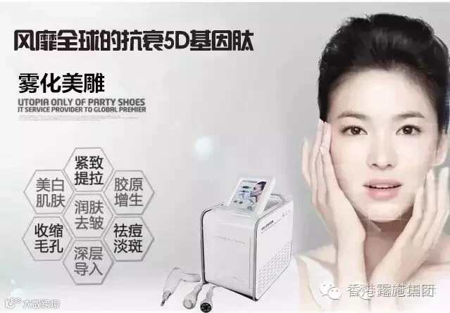 雾化美雕,拥有独树一帜的雾化美雕枪,高速压力机制在1/10000秒瞬时启动,高速将青春细胞复合生长因子——5D基因肽纳米雾化,以“花洒”的形态,定点、均匀、高速地注入中胚叶细胞间,自动修补变异DNA片段,修复断裂的网状纤维,甦活中胚层胶原,从而达到排毒、祛皱、提升、塑型、美白的5D抗衰效果。