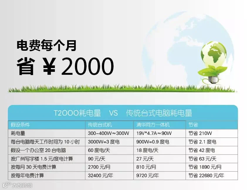 清华同方T2000一体机的耗电量仅仅是传统台式机的三分之一。传统台式机主机的耗电量在230W~400W之间,显示器的耗电量在70W~100W之间,合计在300W~500W之间,而T2000采用19V *4.74A适配器,耗电量为90W。