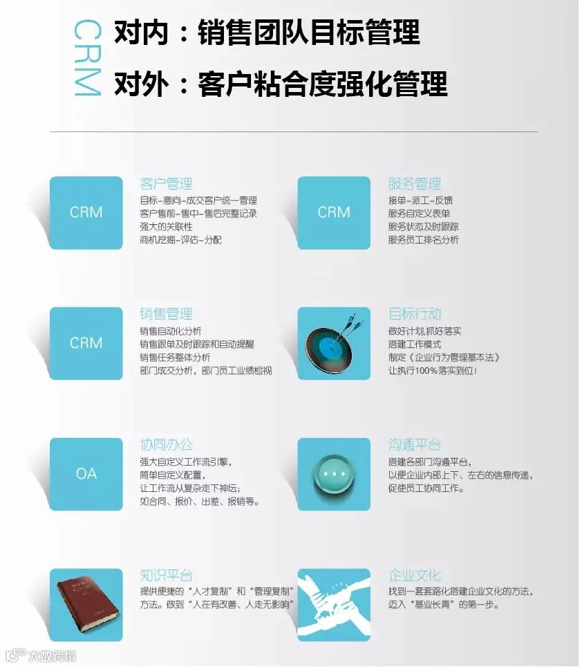 通过建立组织运营管理铁三角(企业文化-知识复制-目标行动),一切围绕以客户为中心的全方位、透明化的业务管理(市场-销售-生产-服务),打造企业组织运营的高效协同管理平台。