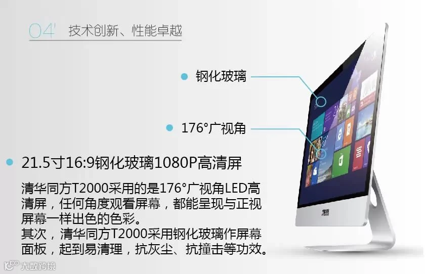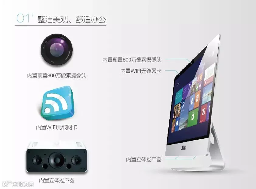 清华同方T2000一体机集成了前置800万像素摄像头、WIFI无线网卡、立体扬声器,目的是让用户彻底摆脱繁琐的电脑外设配件,同时配备无线键鼠套餐,T2000把凌乱的线材全部省去,只需一根电源线,让用户真正体验简约的办公桌面,追求舒适的办公环境。