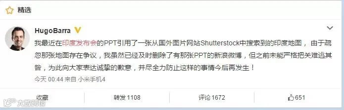 今日上午小米 @HugoBarra 在微博上做出道歉,并表示今后会全力防止此类事情再发生。